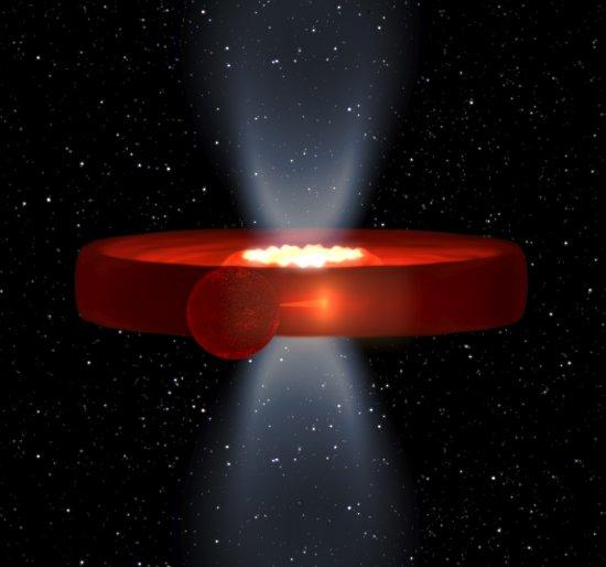 El equipo observó unos extraños eclipses en el sistema que duraban y se repetían cada pocos minutos. Este hallazgo les llevó a dos conclusiones: el agujero negro debía estar casi de canto (tiene una inclinación de al menos 75 grados) y presenta una peculiar estructura vertical situada en el disco de acreción del sistema, es decir, el conjunto de la materia que el agujero va robando de la estrella y que forma una corriente en forma de disco, similar a la que genera el agua al destapar un fregadero.