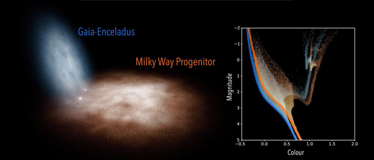 Entre los numerosos hallazgos de la segunda entrega de datos del satélite Gaia encontramos un enigmático diagrama color-magnitud (DCM) de las estrellas del halo de la Vía Láctea. Este diagrama, sin precedente hasta la fecha, muestra una llamativa doble secuencia (azul/roja). La secuencia azul se asoció con una fusión muy temprana de la Vía Láctea con una galaxia satélite (Gaia Encélado). El origen de la secuencia roja era menos claro, y en general se la asoció, por su composición química, con el llamado disco grueso de nuestra Galaxia. Sin embargo, el desconocimiento de las edades de las estrellas en las dos secuencias dificultaba la comprensión de su naturaleza. En nuestro trabajo, comparamos este DCM observado con DCM sintéticos calculados usando modelos de evolución estelar. Esta es una técnica que se ha usado con éxito durante más de veinte años para estudiar la historia de la formación estelar de las galaxias enanas del Grupo Local. Gracias a las distancias precisas proporcionadas por Gaia para millones de estrellas de la Vía Láctea, hemos podido aplicar esta técnica para obtener sus distribuciones de edad y metalicidad. De esta manera, determinamos que las estrellas en las dos secuencias del DCM del halo tienen la misma distribución de edad y se formaron hace más de 10 mil millones de años. En promedio, son más viejas que las estrellas del disco grueso, que contiene estrellas tan viejas como las del halo, pero también estrellas más jóvenes. El diferente color de las dos secuencias es debido a su diferente composición química, con las estrellas azules más pobres en metales que las rojas. Estos hallazgos, sumados a predicciones de simulaciones cosmológicas, también analizadas en el estudio, permitieron completar la historia de la formación de la Vía Láctea: hace unos 13 mil millones de años se empezaron a formar estrellas en dos sistemas estelares diferenciados que luego se fusionaron: una galaxia enana llamada Gaia-Encélado y otra, el progenitor principal de nuestra Galaxia, unas 4 veces más masiva y con mayor cantidad de metales. Como consecuencia del impacto que sufrió la más masiva hace 10 mil millones de años, algunas de sus estrellas y las pertenecientes a Gaia-Encélado adquirieron movimientos caóticos, pasando a formar parte del halo de nuestra Galaxia. El aporte de gas durante y después de la fusión mantuvo la formación estelar en un disco grueso hasta hace entre 8 y 6 mil millones de años, cuando el gas se asentó en el disco fino donde se han formado la mayor parte de las estrellas de la Vía Láctea hasta la actualidad.