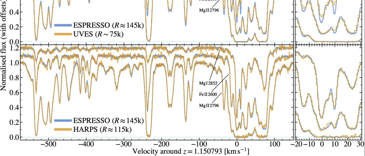 Espectros de ESPRESSO de tres transiciones diferentes en el sistema de absorción a z=1.15 en la dirección del cuásar HE0515-4414, en comparación con espectros anteriores en el mismo objeto obtenidos mediante UVES y HARPS a menor resolución espectral.