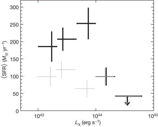 Promedio de la formación estelar, (SFR), derivado de las luminosidades en infrarrojo lejano promediadas para AGNs a1<z<3 en función de suLX.