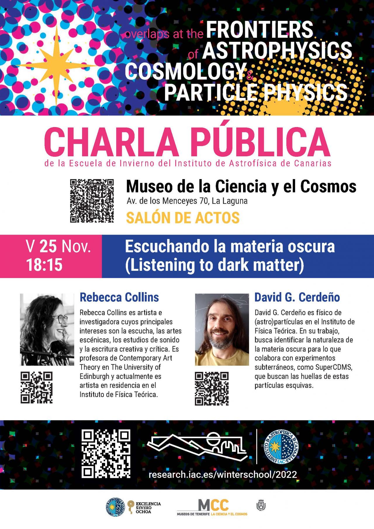 La conferencia correrá a cargo de Rebecca Collins, de la Universidad de Edimburgo y el Instituto de Física Teórica (Universidad Autónoma de Madrid), y David G. Cerdeño, del Instituto de Física Teórica (Universidad Autónoma de Madrid) y tiene lugar con motivo de la XXXIII Canary Islands Winter School - Encuentros en las fronteras de la astrofísica, la cosmología y la física de partículas