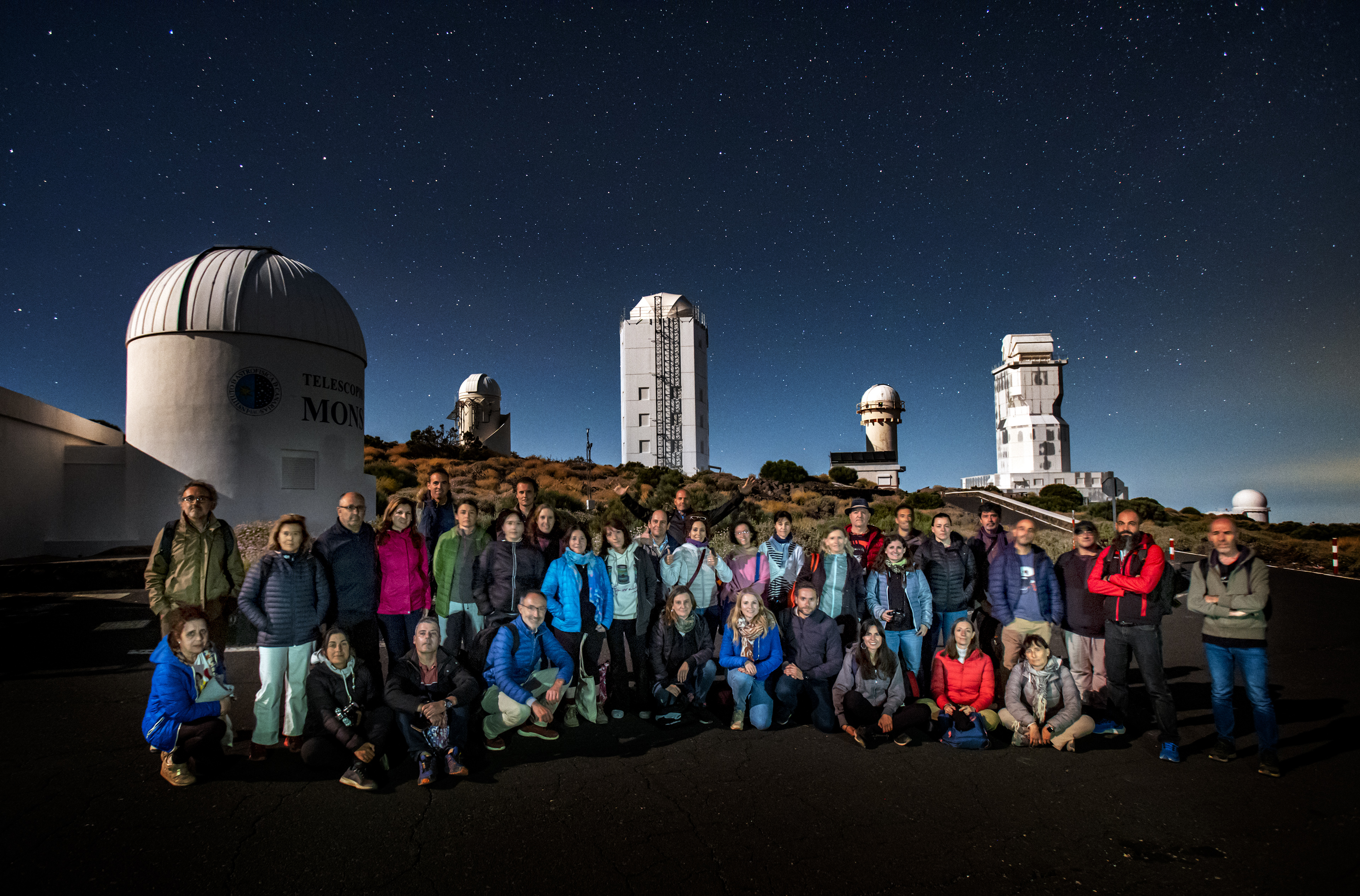 Profesores durante la observación nocturna en el OT, con el telescopio MONS y las torres solares de fondo. Crédito: Daniel López / IAC.